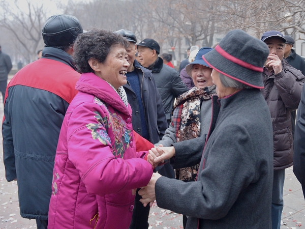 清晨的夕阳红广场上欢声笑语,热闹非凡,洋溢着喜庆气氛。大家热烈交谈,互致问候,表达对新一年的美好祝愿。