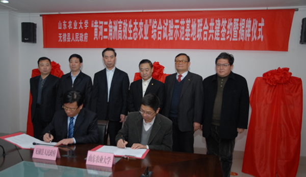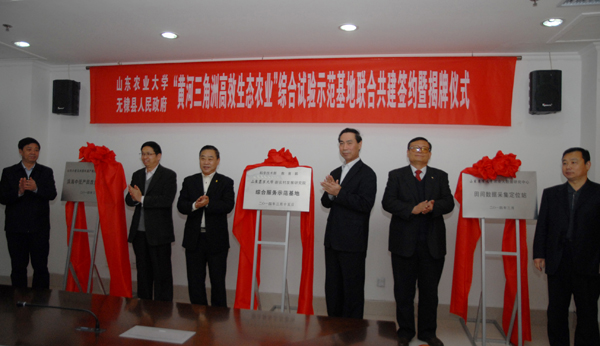 3月15日,3003新葡的京集团网址与无棣县人民政府联合共建“黄河三角洲高效生态农业”综合试验示范基地签约暨揭牌仪式在无棣县举行。山东农大校长温孚江、副校长张宪省,学校科技处处长米庆华,滨州市人大常委会常务副主任曹兴宽、副市长李维东,无棣县县委书记李恩波共同为基地揭牌。张宪省与无棣县县长丁海堂签署合作协议。