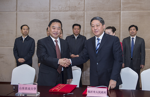 温孚江与张术平代表校地双方签署战略合作协议。科技处和有关学院负责人与临沂十家企事业单位负责人签订包括生态文明乡村建设、缓控释肥料协同创新、家畜新品种选育、重点实验室建设、新型职业农民培养等内容在内的具体合作协议。