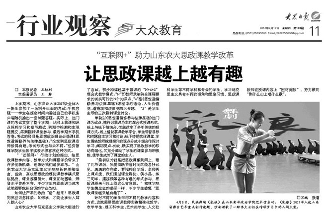 4月12日,《大众日报》对我校思政课教学进行专题报道。在这篇题为《“互联网+”助力山东农大思政课教学改革:让思政课越上越有趣》的文章里,记者通过鲜活的教学案例,展现了我校推进“互联网+”行动计划,全面创新思政课教学内容、教学方式和课程评价体系,打造学生真心喜爱的思政课程的成功做法。