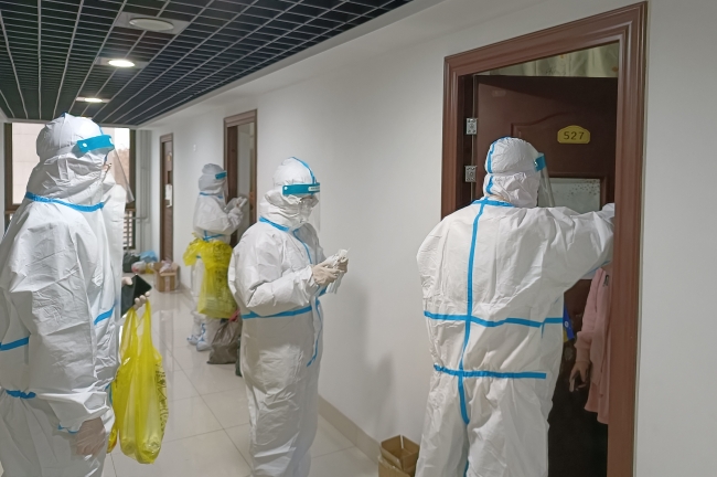 还有医务人员的孩子是毕业班,无法陪伴孩子上网课;有的同志因为封在学校,把仍在哺乳期的孩子交给了父母;有的怀孕的同志,克服妊娠反应,留守岗位;有的同志身患高血压、腰椎间盘脱出、膝关节退行性病变等慢性疾病,但仍在坚守岗位,参加核酸采集等工作。
