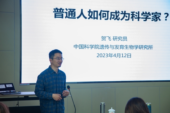 贺飞以“从西南从业大学到中科院遗传所——聊聊一个普通人如何实现自己的科学家梦”为题,从儿时受到袁隆平院士“禾下乘凉梦”的影响立志成为一名农业科学家,求学时期从本科到博士的学习科研经历,10年的海外博士后工作,学成归来就职于中国科学院遗传与发育生物学研究所的经历娓娓道来,用幽默风趣的语言,赢得了现场师生的阵阵掌声,引起学生强烈共鸣。贺飞叮嘱同学们要制定长期和短期奋斗目标,进而围绕目标制定好学习计划,脚踏实地付诸行动,一步一个脚印走出属于自己的人生。同时要练就强大的内心,正确面对挫折和困难,锲而不舍继续向前。要结合自身优势善于在科学研究中发现新的突破。从身行万里的求学游子,到潜心研究的科技工作者,再到将自身所学报效国家,贺飞用自己的亲身经历,诠释了什么是科学家精神。