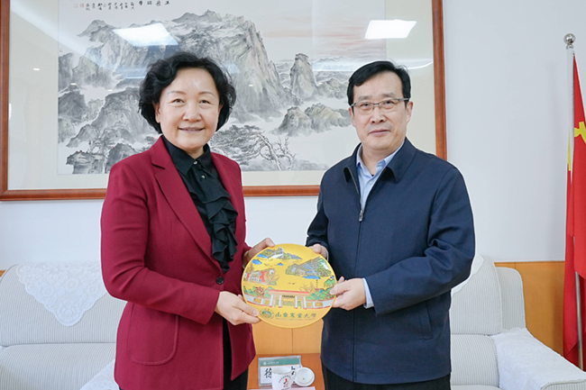 徐剑波对魏艳菊一行来访表示热烈欢迎,对山东青年政治学院近年来取得的成绩表示祝贺,并简要介绍了学校办学历程和近期发展成就。他说,学校正处于“双一流”建设的攻坚阶段,2个学科入选了省一流学科建设“811”项目,并组织召开了“冲一流”建设方案论证会,邀请院士专家把脉问诊,建言献策。全校上下紧紧围绕一流农业大学建设目标,以“五大攻坚战”为抓手,服务国家和区域重大战略需求,加强科技原始创新能力,先后成立了德州(齐河)小麦产业研究院、聊城茌平现代设施农业产业研究院等一批科研平台,解决产业“卡脖子”难题,以务实举措推动“双一流”建设工作取得扎实实效。山东青年政治学院与山东农大交流频繁、关系密切。两校学科、人才队伍建设优势互补,希望新的一年,两校在良好合作基础上,不断拓展合作的广度与深度,挖掘新的合作增长点,携手实现两校共赢发展。
